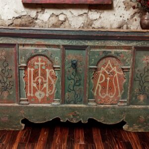Frontale e zoccolo interamente scolpiti a mano, raffiguranti motivi religiosi.