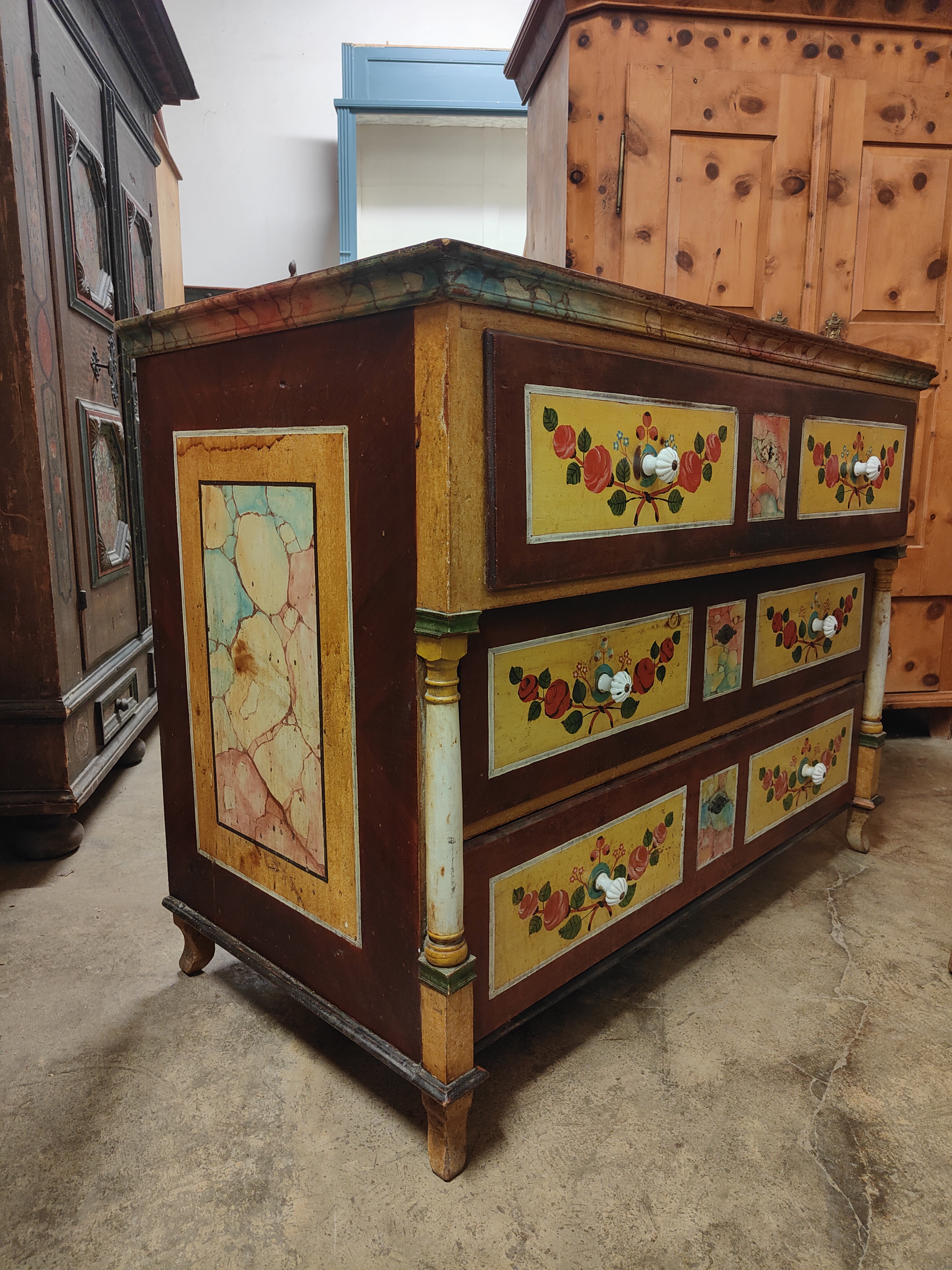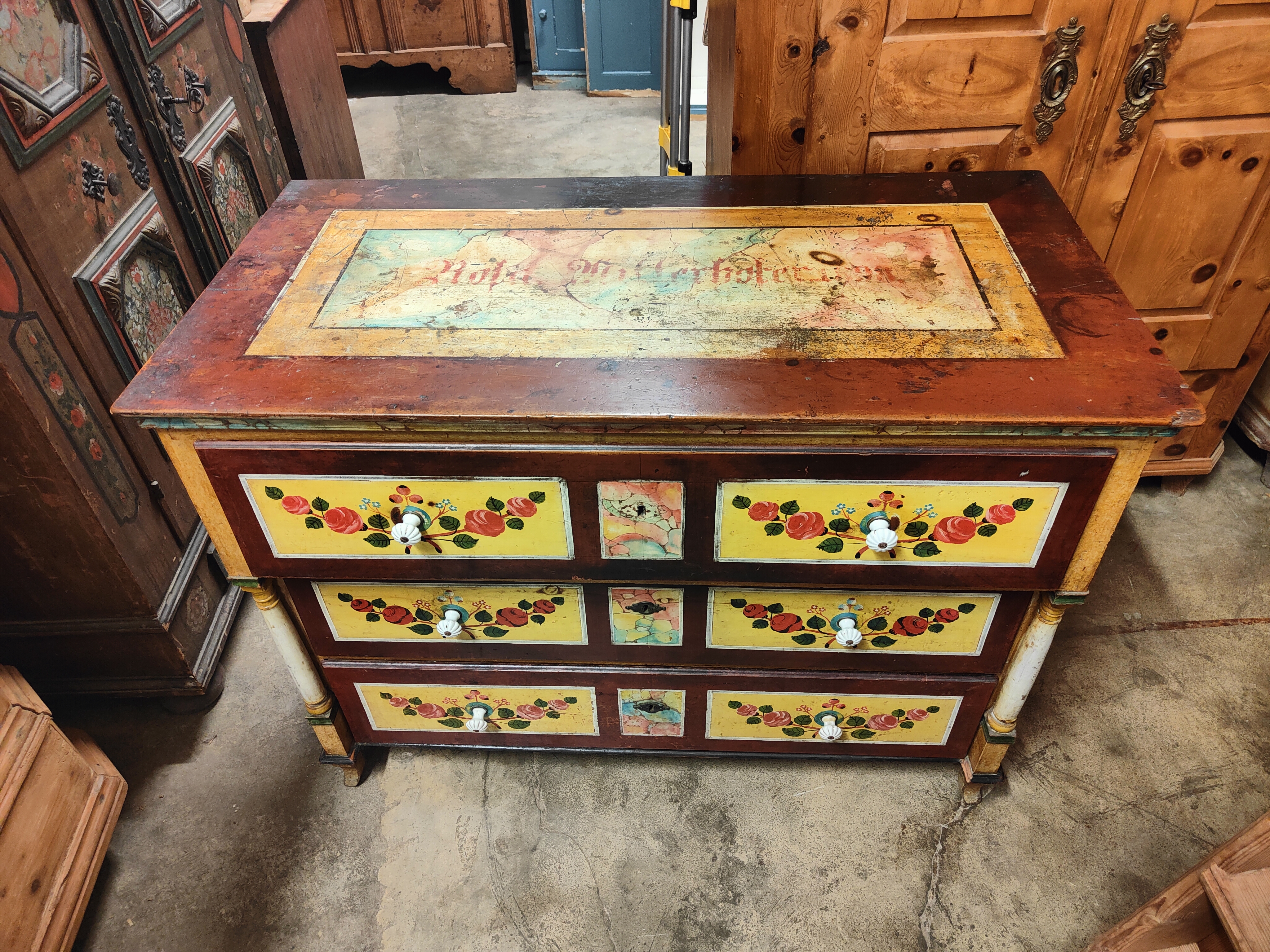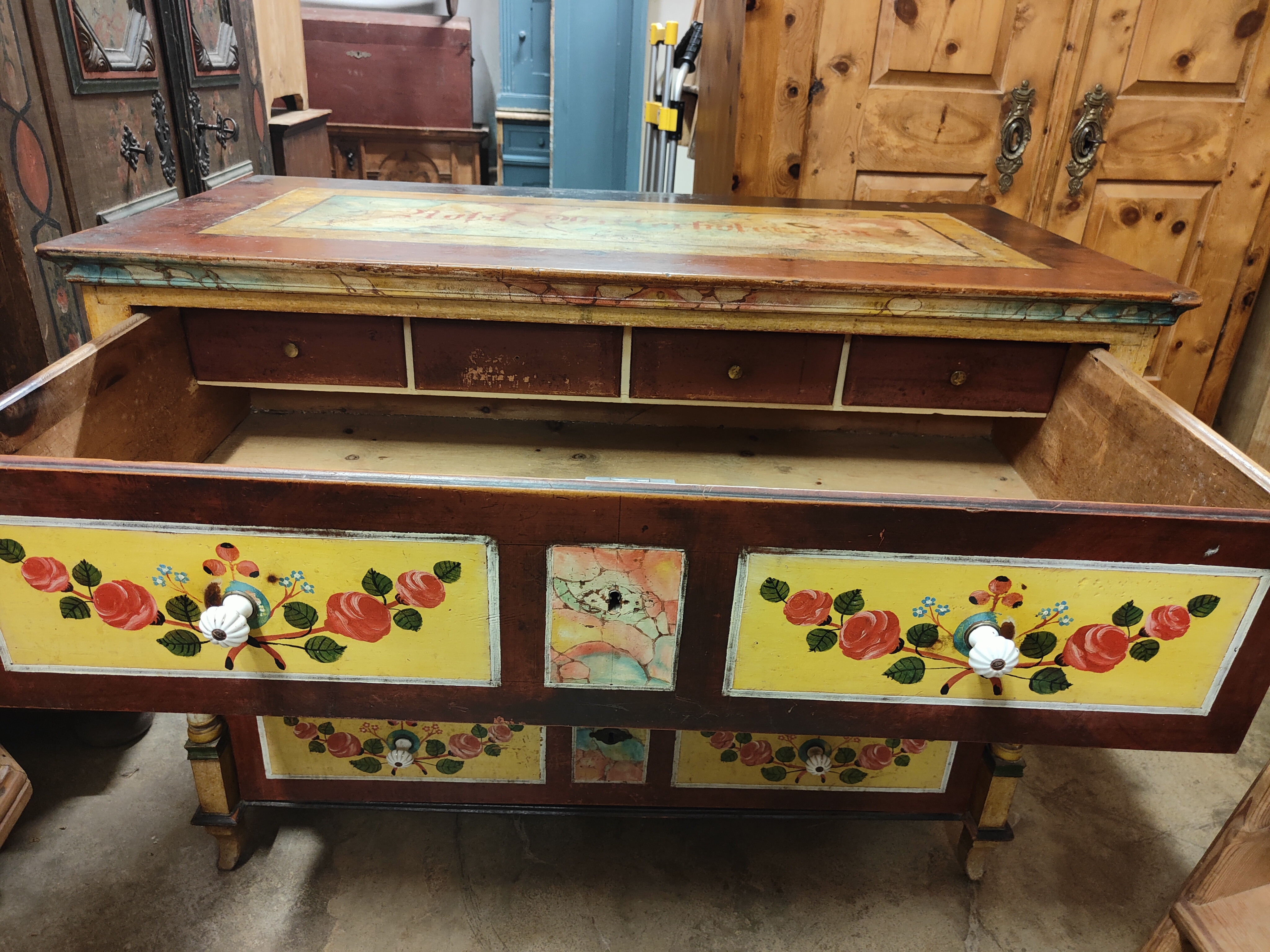 Magnifico cassettone in cirmolo proveniente dalla Val Senales, datato 1898.